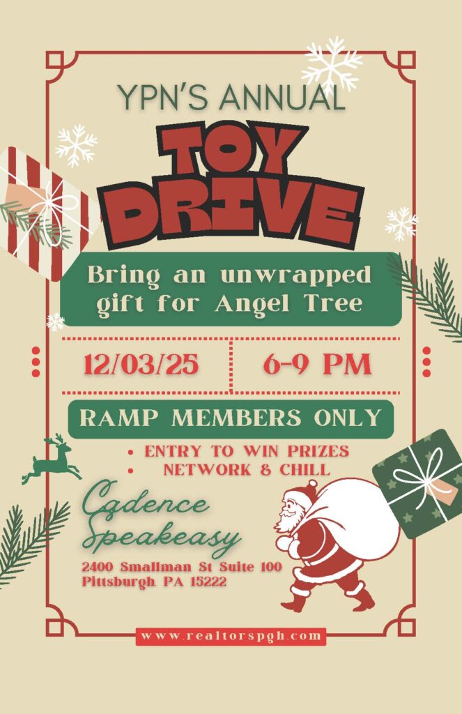 The Young Professionals Network invites you to their Annual Holiday Toy Drive on Wednesday, December 3rd at Cadence in the Strip District (2400 Smallman St, Suite 100, Pittsburgh, PA 15222) from 6–9 PM.